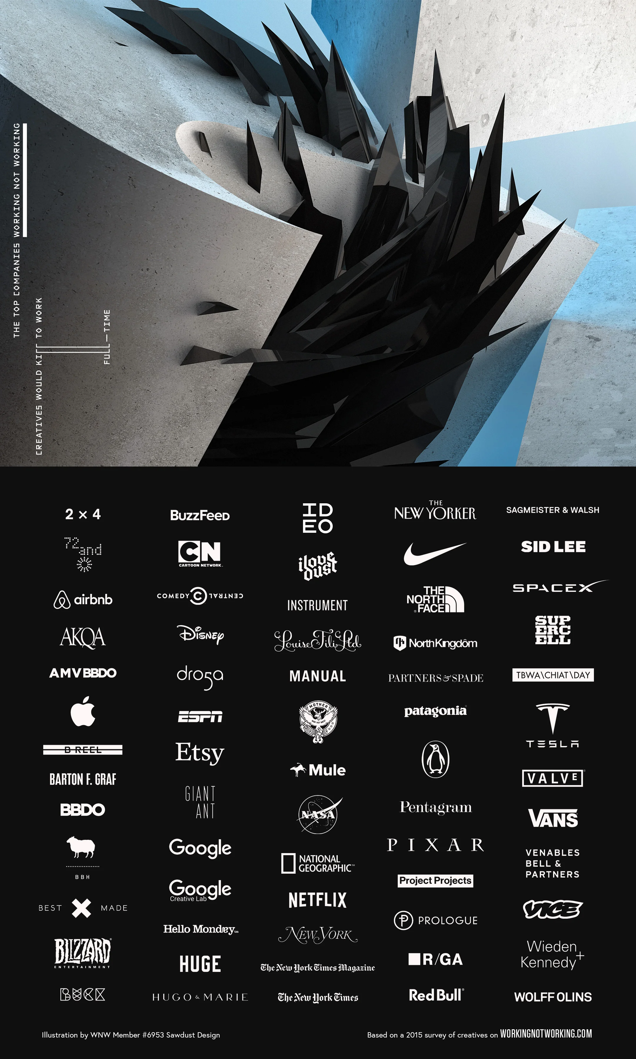 So this year, we did it again. Out of the 195 companies our members cited, this is the list of the most popular. Given that Working Not Working represents the world's best creative talent (we accept less than 10% of applicants), our members can provide a unique perspective on the most desirable places to work across advertising, design, animation, production, media, tech and the many other industries prioritizing creativity.